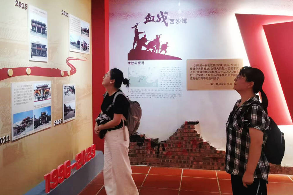在西沙湾畔的解放军庙前,一尊石雕格外引人注目:一位解放军战士怀抱着一名小女孩,目光坚定望向远方。这是全国唯一一座专门为纪念解放军烈士而建的庙宇,被誉为“天下第一庙”。支部一行人走进烈士纪念馆,认真学习解放军庙建造过程,观摩社会各界的留影和题词。其中最为醒目是叶飞上将的题词“为了人民,死的光荣”,让大家为之一振。通过参观学习,让大家了解解放军烈士庙在体现“军民鱼水情”的重要意义,接受一次生动的爱国主义教育。